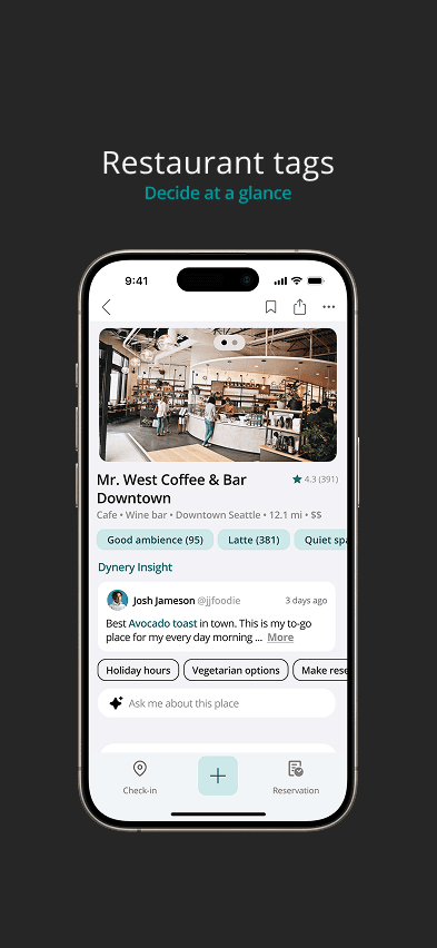 Based on the user profile from onboarding and activity history in app such as saved places, lists, Dynery prioritize recommending the places have the most shared tastes.