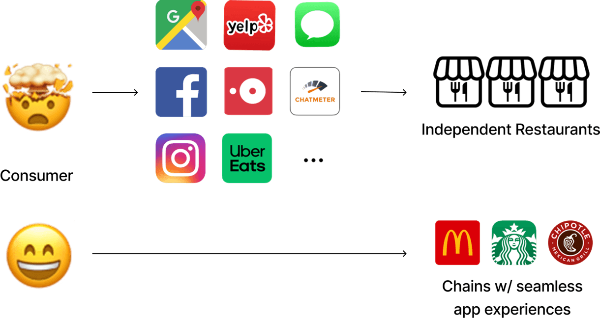 Consumers go through multiple apps to discover independent restaurants. For chain restaurants, it’s much easier with 1-stop proprietary apps.